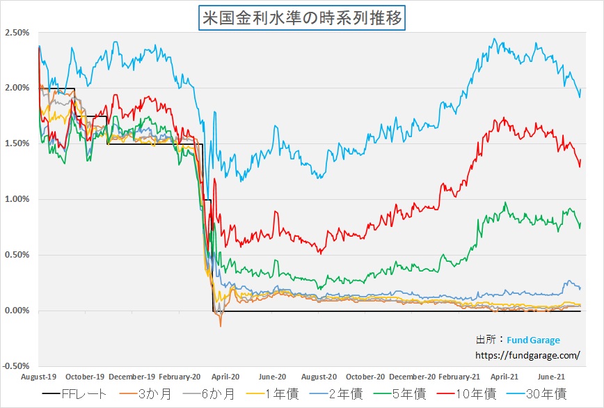 7月4日の米国独立記念日前の最後の取引日となった7月2日の米国国債市場では10年債利回りが1.42%までグイっと低下(債券は買われた)したが、今週6日からの取引再開でも債券金利は3日間連続で金利が低下(債券市場が3連騰)し、なんと8日は1.29%と2月17日以来の低水準(債券価格は上昇)を付けて終了した。6月のFOMC後にFRBの利上げ想定タイミングが早まった(予想以上に景気回復が早く、インフレリスクが高い)と読み間違えた市場は、FOMCの議事録が開示されるまでは景気回復に楽観的だったが、漸く現実を直視した。週末9日には1.36%までは金利は押し戻されたものの、30年債利回りは1.99%と2%台を回復しないままに終わった。そんな流れを感じるためにも百聞は一見に如かず、今週も利回り推移のチャートをお届けする。