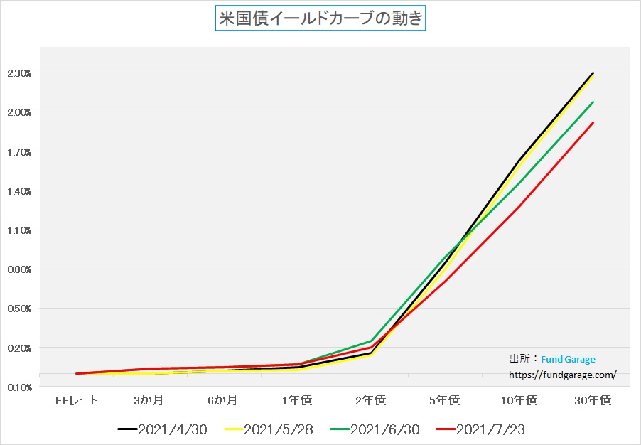 下のチャートは所謂「イールドカーブ」で、4月末から各月末と、先週末のイールドカーブを示している。黒と黄色の線は4月末と5月末だが、殆ど同じと言ってよい。一方で、緑の6月末と、先週末の赤、どちらも長期金利が低下している。一方で、2年債以下の短い期間になると5月末の黄色の線が一番低金利にあったことが分かる。すなわち、足元の景気は悪いが、のちに一気に回復するから金利が長い方ほど上昇している。すなわち、早期の景気回復期待が根強かったということだ。