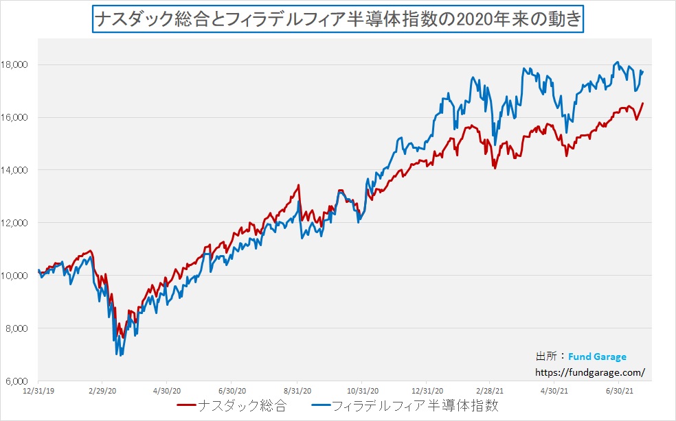 ナスダックもNYダウやSP500と共に最高値を更新しているが、残念ながら上記2銘柄のような状況もあり、フィラデルフィア半導体指数は伸び悩んでいる。下に示すのはその二つの指数だ。ナスダック総合を引き離す力は今は感じられない。
