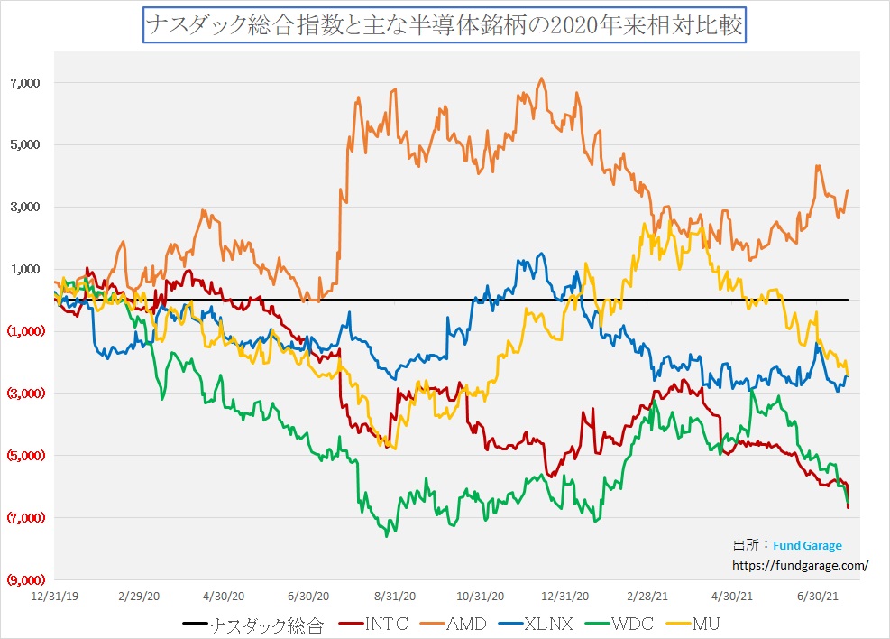 それは次のチャートを見ると何が起きているのかが良くわかる。インテルからシェアを奪っているAMD、またそれと合併しようというXLNXことザイリンクス。この二つは合併が中国の独禁法当局から承認されるかどうかで足踏みが続いているが、それぞれのビジネス自体は好調だ。なにせAMDはインテルからシェアを奪っているのだから。それが相対パフォーマンスにも表れている。