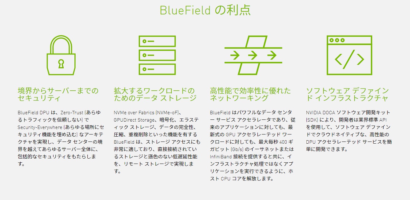 ここでエヌビディアのWebページから同社DPUのBlueFieldについて説明した部分を引用させていただく。