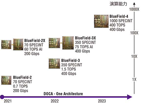 X軸を見ると2021年に始まって2023年までと期間はまだ短い。だが問題はY軸にある。演算能力を示しているが、これが対数チャートの目盛りになっている。それでもなお放物線上に成長するというのだから、もし通常目盛りで作成したら、飛んでもないチャートが出来上がる筈だ。実際にエヌビディアは既に2022年に登場するBlueField-3は発表しているので、リアルなものだろう。このBlueFieldというのがエヌビディアのDPUの名前だ。