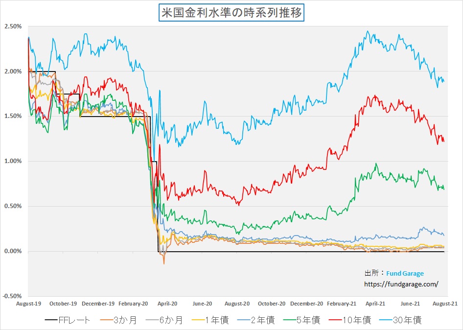 では、米国長期金利の推移チャートを見てみよう。正に米国長期金利が景気回復期待の行き過ぎた楽観論に一旦終止符を打って金利低下に転じたのが正にこの3月のFOMCのタイミングだったことが分かる。当然その後も根強い景気回復期待の楽観論と金利上昇(テーパリングや早期利上げ開始説)を唱える市場関係者は多く、一気に金利低下とは行かなかったが、ご覧の通り、30年債、10年債共に金利水準の居場所は随分と低いところまで低下した。