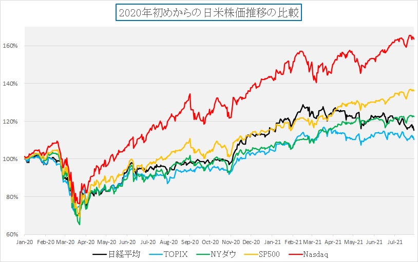 まず赤い線で表示したNasdaq総合指数の堅調さがひと際目立つのは言うまでも無い。DX(デジタルトランスフォーメーション)がパンデミックによって加速したのだから、その恩恵を一番受ける企業群で構成されている指数であることは疑うことがない。だが、どうもこれではその傾向値、すなわち日米の動きに違いが表れた時期を特定出来ない。ただ明らかに日本は途中から置いてかれている。黒い線で表したのが日経平均株価だが、これだけ見ると2月に3万円台の最高値を付けたあたりをピークに下降トレンドに入っているように見える。そこで最初は日経平均株価が3万円台を回復して最高値を付けた辺りを基準点に5指数のパフォーマンス比較をしてみたが、上記のチャートでも明らかな通り、3月8日までNasdaq総合指数を先導役に急落している(米国の金利上昇を警戒した動き)こともあってか、分かり易い分岐点は見出せなかった。
