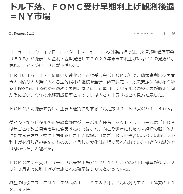 調べてみると、3月16日(火)と17日(水)(米国なので日本では17日と18日)に米国ではFOMCがあり、3月18日(木)と19日(金)には日銀金融政策決定会合が開催されていた。この時、Fund Garageの公式Facebookにシェアしたロイターの記事があった。当時、マーケットはワクチン接種の普及加速からデルタ変異株へのリスクは片目で認識しつつも、寧ろ景気の早期回復を読んで米国長期金利が上昇、早くもテーパリングや利上げ観測を唱えて右往左往しているところだった。それを見事に否定したのがFOMC後の声明だった。