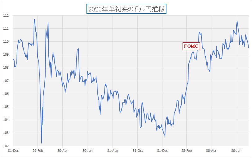 実はドル高も進んだことが確認出来る。FOMCの週にはドル円は109円前後となっているが、それは基本的には年初102円台から始まった円安の流れだ。その後、ドル円は110円台となり、この週末や若干円高ながら109円72銭で終わっている。下のチャートは2020年初めからのドル円為替の推移を日次で示したものだ。明らかなことは、この動きを金利差で説明しようとしても全くしっくりくることは無く、おまけに2021年に入ってからは完全に円安だということだ。