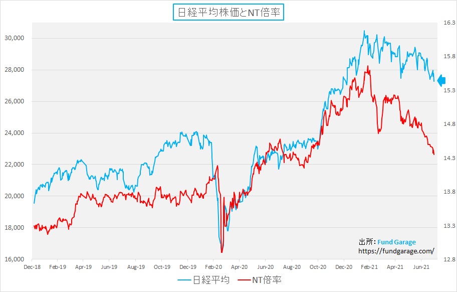 また景気回復期待で踏み止まったTOPIXに対して、金利上昇懸念から値がさグロース株が多い日経平均株価、そのNT倍率は順調に低下してきている。勿論、足元の日本国内の新型コロナウイルスの感染急拡大が更に加速し、デルタ変異株だけでなく、更なる変異株の登場や菅政権の求心力喪失から景気回復期待が剥落するようなことになれば調整は長引くかも知れない。