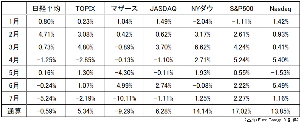 どの程度、日米株式市場で明暗が分かれているかは数値を見るのが一番だ。月次騰落率と年初来騰落率を纏めると下表のようになる。