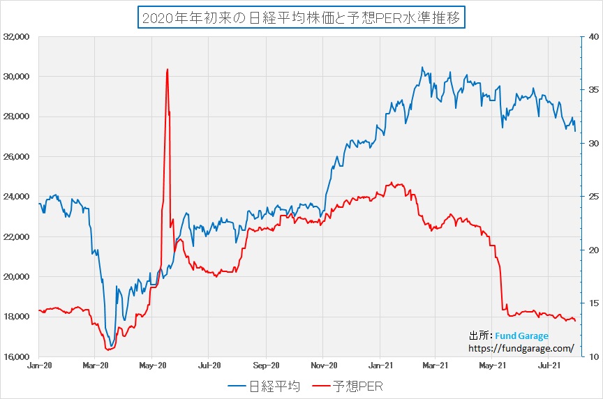 ならば日本株に投資チャンスは無いのか?答えはNOだ。まずは下のチャートを見て貰いたい。赤線で示しているのが日経平均株価採用225銘柄の予想PERの推移だ。現時点において、既に13.34倍にまで低下しているのが分かる。