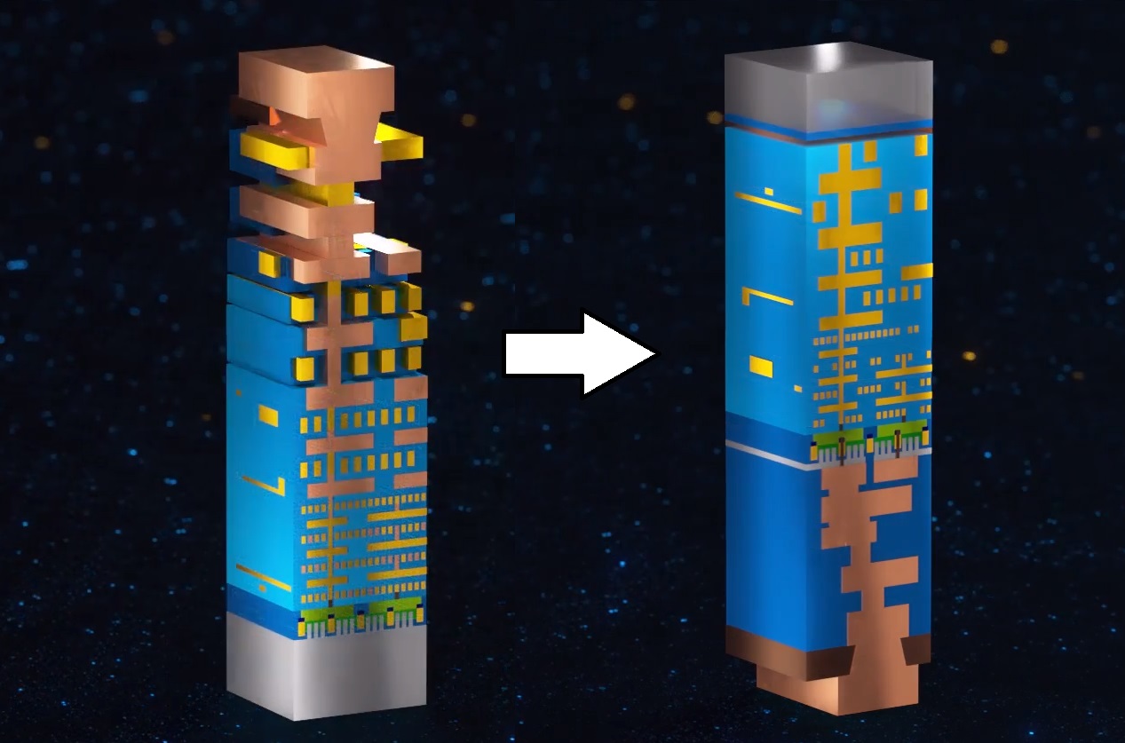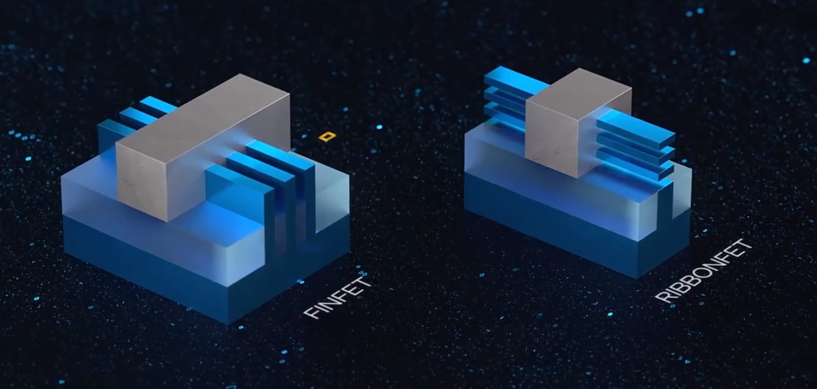 Intel 20Aでは新しいブレークスルーとなる技術として「RibbonFET」、「PowerVia」の2つが投入される。RibbonFETは、FinFETをさらに強化した3Dトランジスタ技術で、FinFETと同じスイッチングスピードと電力消費を維持しながら、底面積を小さくできる。その違いを下の写真で見て頂こう。チャネル(電流の流れる道)を縦方向に積み重ねることで、明らかに床面積を小さくすることが出来ている。