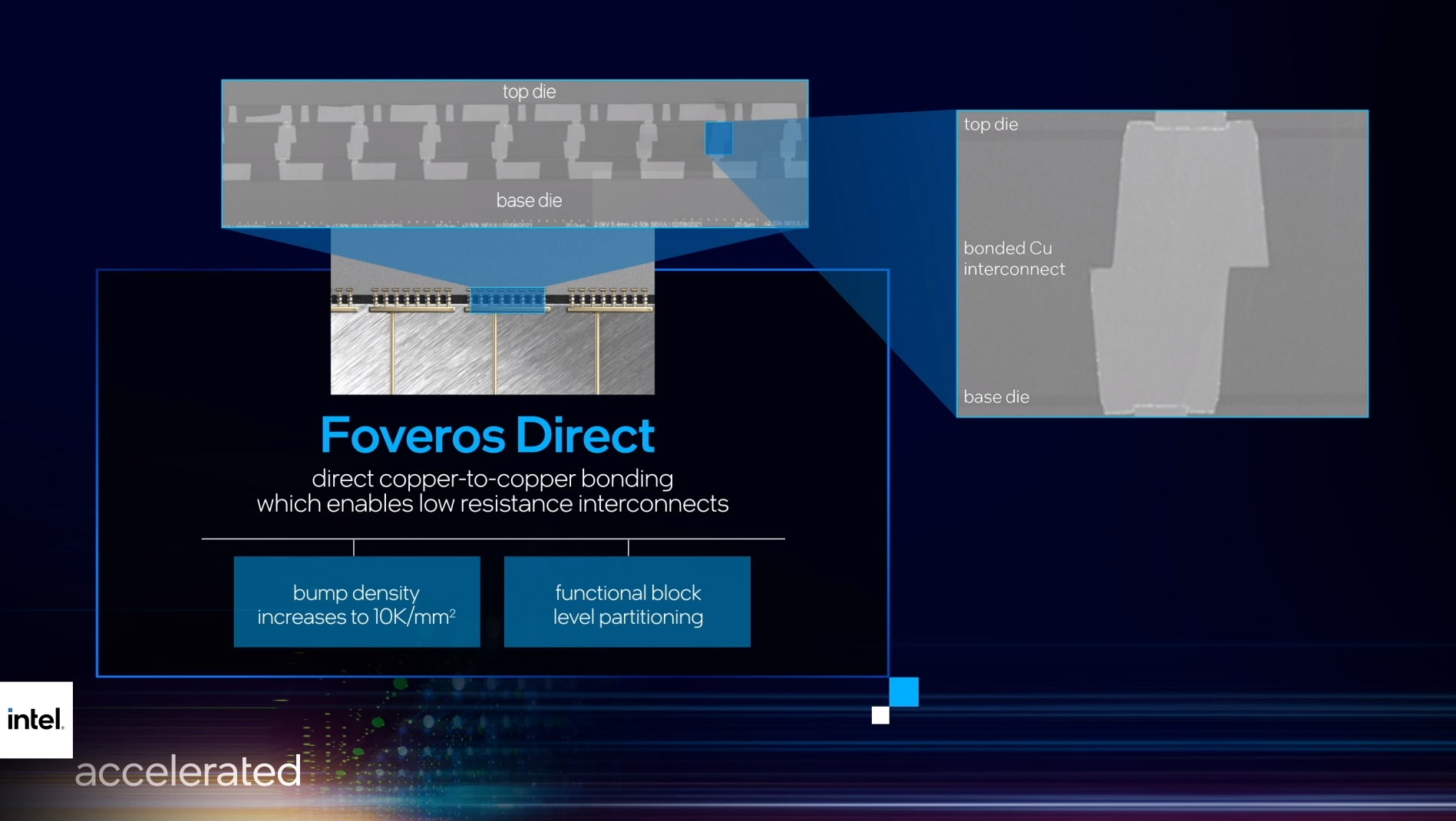 Foveros Directでは10マイクロン以下のバンプピッチが実現され、さらに高密度の3Dダイスタッキングが可能になる。