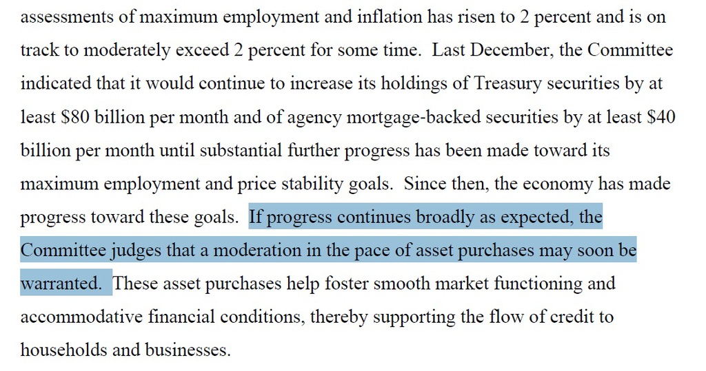 次に掲げるのがFOMCのステートメント原文であり、ハイライトしてある部分がテーパリングの話題の肝の部分だ。ポイントとなるのは「may soon be warranted」だが、ご興味があれば画像をクリックして貰えれば、原本のPDFがダウンロード出来るようにしておいた。