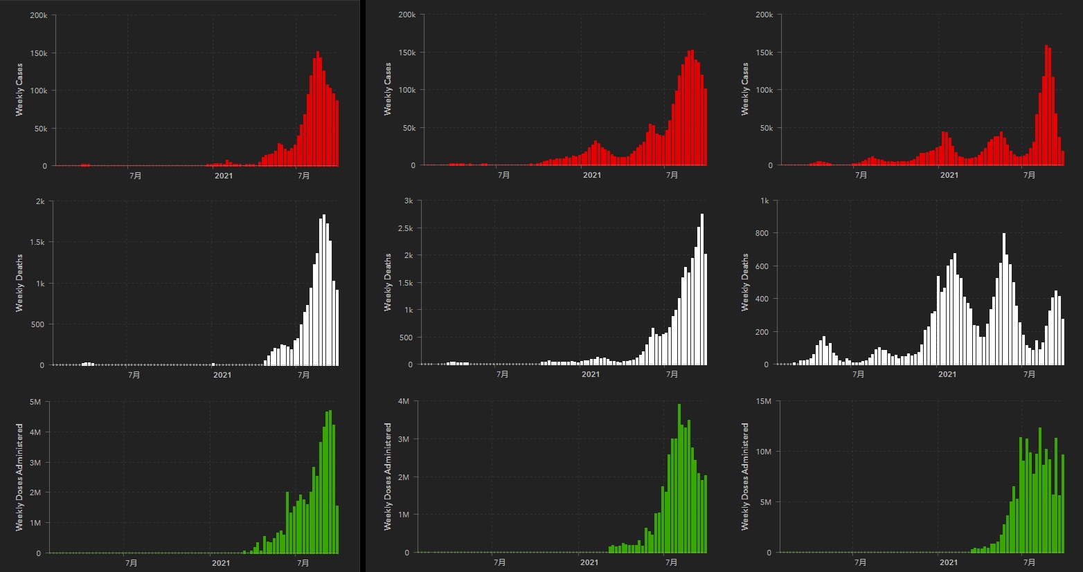 下のチャートはジョンズホプキンス大学のデータで、左がタイ、真ん中がマレーシア、そして右が日本となり、上からWeelyベースの新規感染者数、亡くなった人の数、そしてワクチンの接種件数だ。形やトレンドは似ているようにも見えるが、チャートのマジックがあるので注意して観察しないとならない。