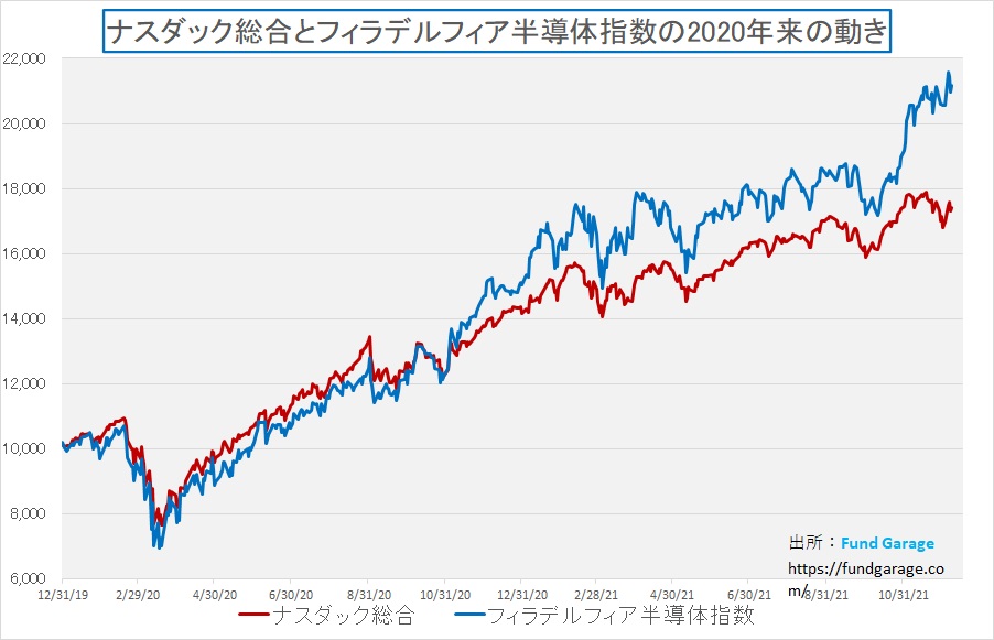 まずおかしいと思っているのが最初チャートだ。ナスダック総合指数とフィラデルフィア半導体指数の動きを比較したチャートだが、半導体指数がこれだけナスダックをアウトパフォームしている意味が分からない。フィラデルフィア半導体指数とは、定義としては半導体の設計・製造・流通・販売を行う企業30社で構成されるとされている。具体的にはMFCLなどに含まれているような銘柄が多い時価総額加重平均型株価指数なので、現在影響力の大きい銘柄はエヌビディアやAMDなどになる。ザイリンクスなども含まれるが、まずこれらは足元では合併承認などの問題もあり、ここまでは加速していない。寧ろやや調整局面だ。また半導体製造装置と言えば、アプライド・マテリアルズが筆頭に上がる。これも前回の決算発表でサプライチェーンの目詰まりが原因で味噌をつけてしまい伸び悩んでいる。露光装置で大活躍のASMLも、同様にサプライチェーン問題で市場評価はやや様子見という感じだ。だがそれでも下記のチャートが示すような値動きになるのは、正直「何が貢献しているんだろう」と思わずにはいられない。