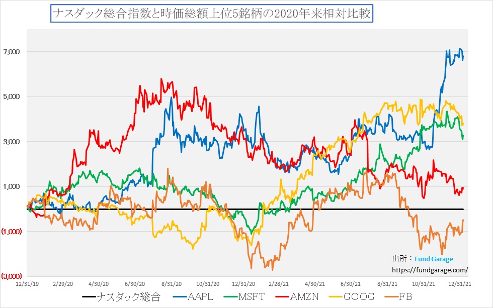 ならばGAFA+Mはどうかと言えば、こちらもアップル、アルファベット、そしてマイクロソフトが相対的にやや失速する中で、アマゾンドットコムとメタ(旧Facebook)が切り返しているのがわかる。