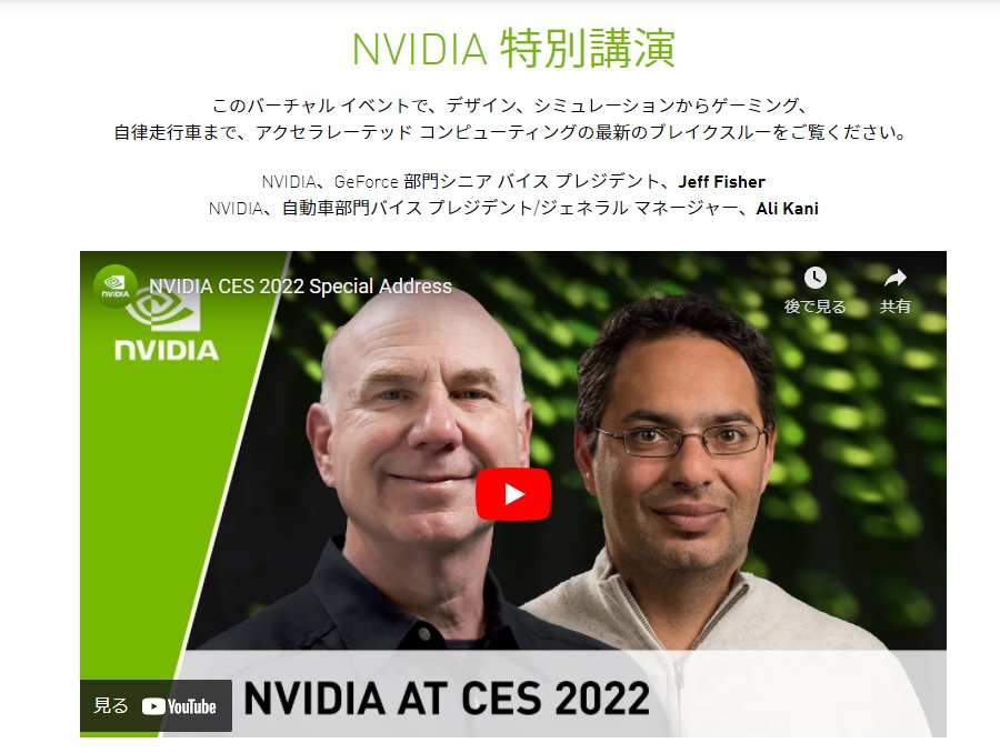 敢えて、ソニーの動画へのコメントをしないままに、次にもう一つの動画をご紹介する。それがエヌビディアがCES2022用に用意した特別講演の動画だ。いつものようにJensen CEOがキッチンから話すスタイルではなく、同社GeForce 部門のシニア バイス プレジデントであるJeff Fisher氏と自動車部門バイス プレジデント/ジェネラル マネージャーであるAli Kani氏がプレゼンを行っている。