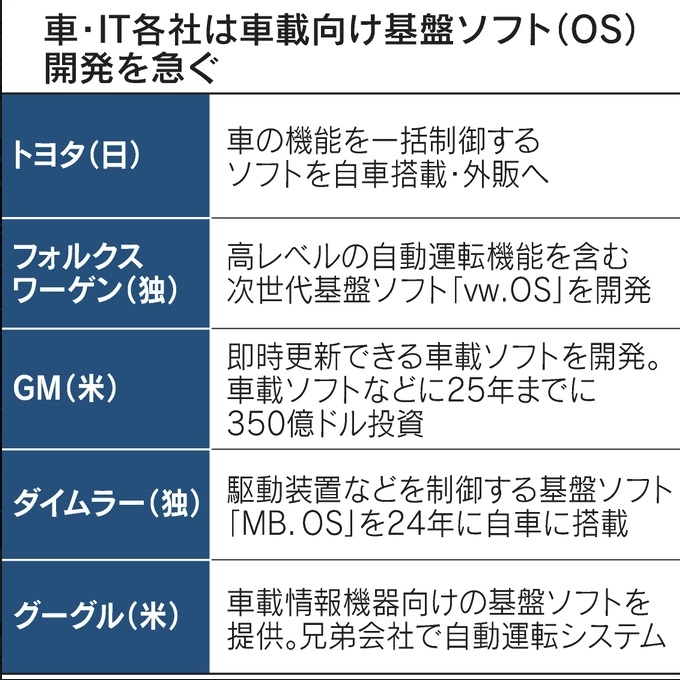また年初1月4日の日経新聞には「トヨタ、25年メドに車の基盤ソフト IT大手対抗へ外販も」という記事が掲載され、下のような図が掲示された。もし本当にアップルやソニーが独自ブランドの電気自動車を開発したり、Googleのandroid OSのような発想のOSの上で動く自動運転車が出てきたら楽しいかも知れない。きっと納車の儀式も既存のディーラーのそれとは違う、またレクサスなどが目指したものとも違う方向性の「おもてなし」、いわばスティープ・ジョブズが拘った「箱を開ける時から始まるカスタマーエクスペリエンス」のような演出も始まるかも知れない。