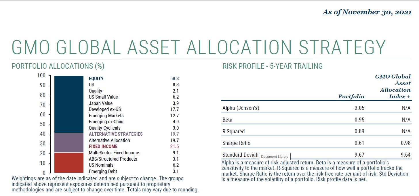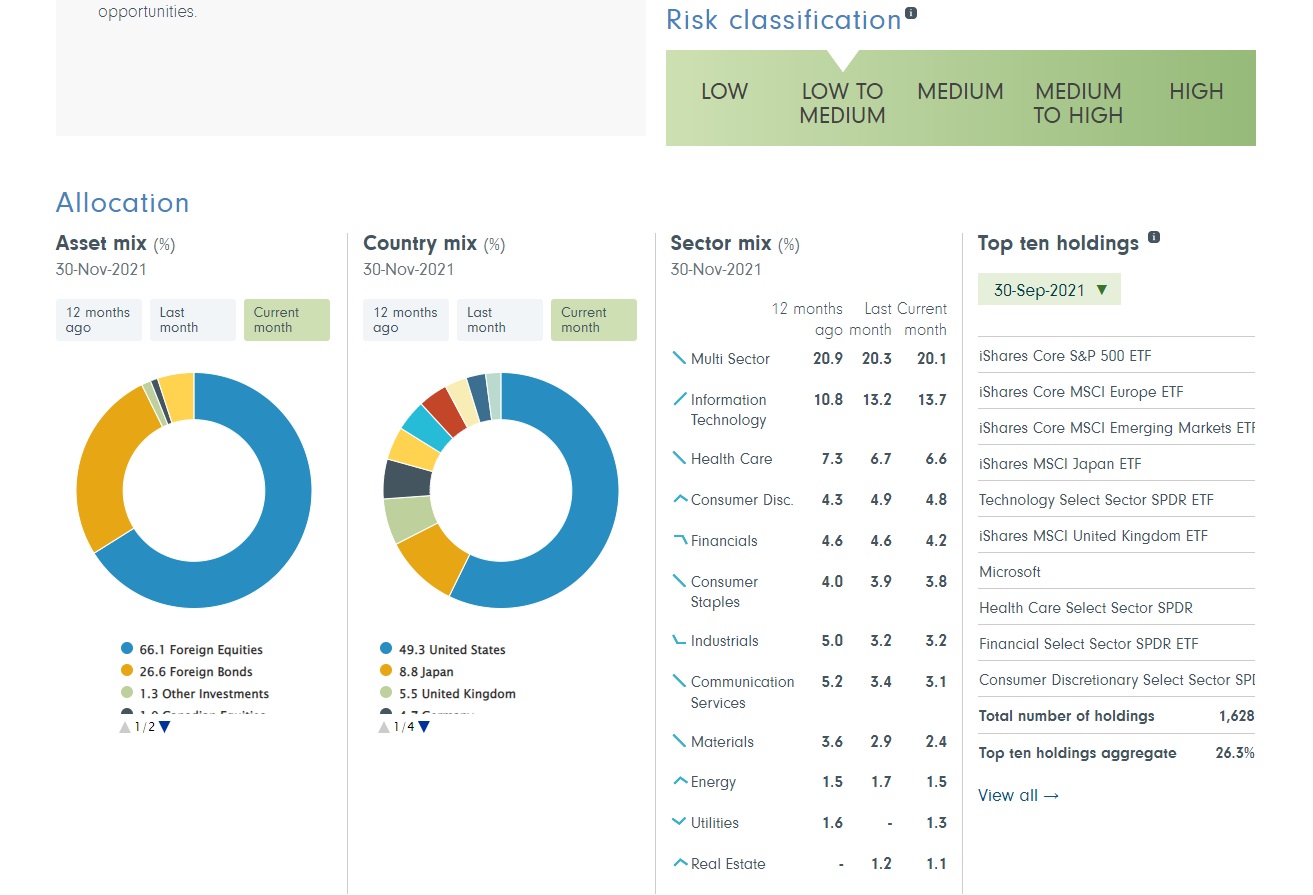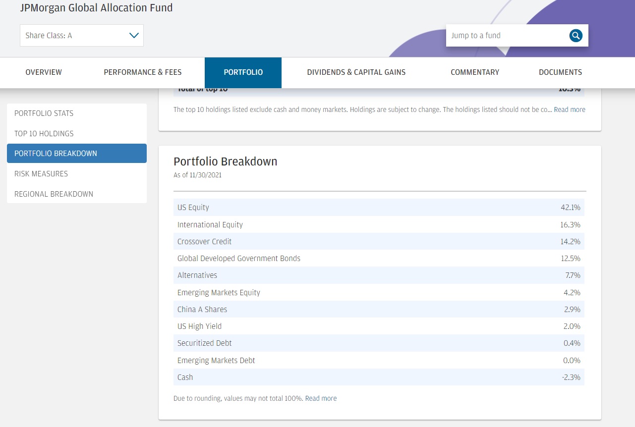 上記の場合だと、中国A株の2.9%まで含めて61.3%が株式で、先進国国債とクロスオーバー銘柄(投資適格と非投資適格の間に位置する銘柄)などをメインに債券は28.7%だ。