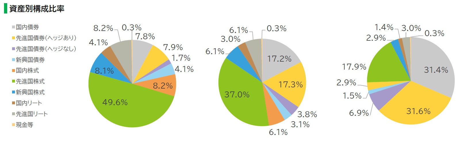 上記にはあえて注釈は不要だろう。一方、下記が日本の代表的な投資信託の運用会社が国際分散投資用のアセット・アロケーションとして提供しているサンプル。右側に行くほどリスクが低いと思われている。一番左側の高リスクタイプでさえ欧米のアセット・アロケーションの平均的なレベルだ。これが日本の資産運用業界の常識だ。