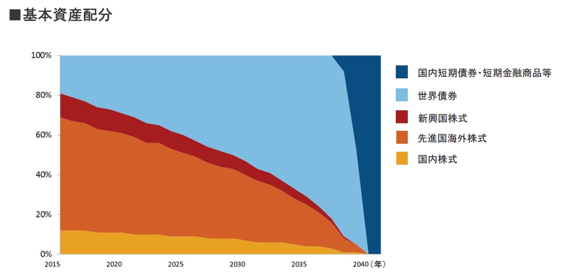 「ゴール・ベース・アプローチ」とか、「ターゲット型」などと言って、将来の目標に合わせて長期投資のアセット・アロケーションを変更するという考え方がある。ただ40年間の宴を享受したあとの債券投資がこの先も本当に「低リスクの安定運用対象」という保証はどこにもない。寧ろ考え方を変えないといけない。金利が上昇するという予想を正しいとするならば、下記のようなターゲット型アセット・アロケーションを採用したら、歳を取る程、リスクが実は高まっている(価格変動リスクは上がらないが「実損が出て元本を毀損する」という本来的な意味での「リスク」)運用となる可能性は高い。