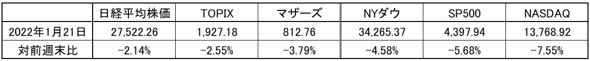 詳細に入る前に上段のテーブルにある先週一週間の日米株式市場のインデックスの騰落率を見てみよう。米国市場の下落率は久しく見ていないレベルのものだ。更に段落下に貼った今月初めからの累積の騰落率では、既にNASDAQは△12%、マザーズが△18%に達しており目を見張る。ただこれは前回「今年2022年は投資家の胆力が試される年になる」とお伝えした通りであり、既に「市場の神様」は投資家の投資哲学を既に試そうとしているかに見える。「市場の神様」は単なる「相場師」や「投機家」を嫌う。だから時々こうした振い落しのテストをされるが、冷静に投資環境を考えれば、多くの人が腰が引けて投資から撤退している時こそ、価値を見極めてエントリーするチャンスだと言える。誰もが買い難い時こそ、実は絶好の買い場になっていることが山のようにある。また「底値で買って、天井で売る」という理想を目指しても、その間に一度も胃が痛い思いはしないということなど、実は絶対にあり得ない。仮に数回はあったとしても、そんな夢のような投資が長く続くことは無いということは、是非、肝に銘じておいて欲しい。