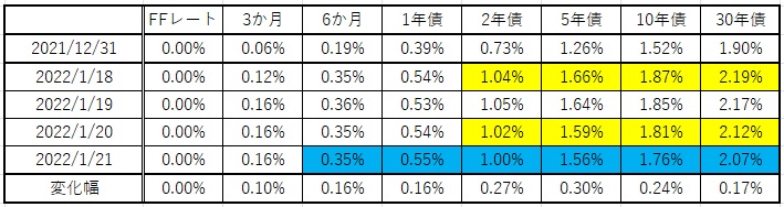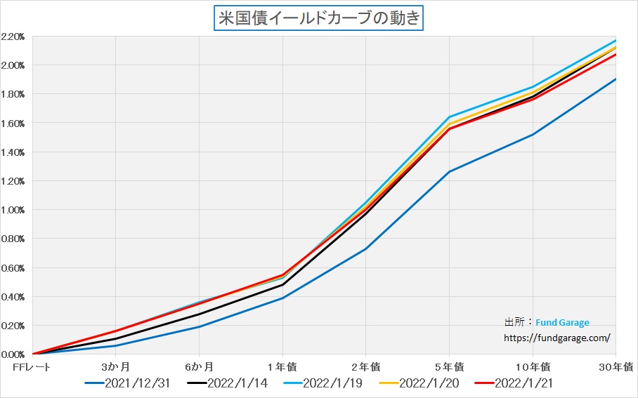 明らかに一つ言えることは、金利は最安水準よりは高くなってはいるが、今の水準をもって(歴史的にも)「高い」とは言えまい。5年債と10年債がパンデミック前まで水準を戻したようにも見えるが、FFレートから2年債まで5種類の金利は2020年3月の急激な利下げの開始の前の水準さえも回復してない。更に、先週のイールド・カーブの変化を確認すると1月19日が最高値で、20日、21日と金利低下していることが分かる。勿論2021年12月31日(紺のライン)よりは上昇しているが、その上昇幅はファンドマネージャーの感覚で言えば「極めて微小」なものだ。