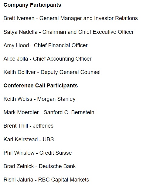 決算発表に関わるカンファレンスコールは当日の現地夕方5:30から行われた。メインとなる参加者は下記の通り。そこは天下のマイクロソフト(MSFT)だけあって、会社側の出席者も証券会社のアナリストも中々著名な人たちを顔を揃えている。