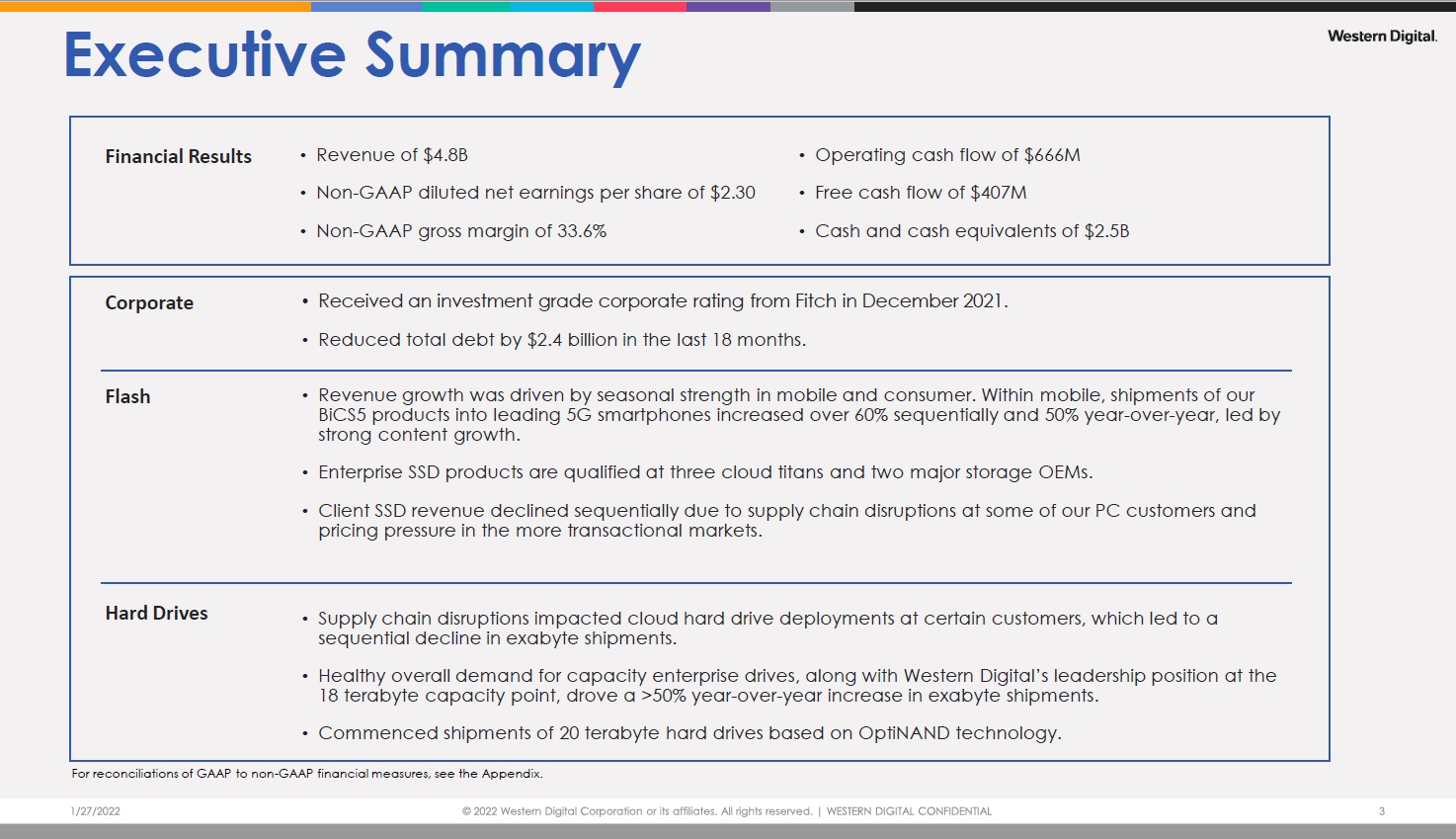 下記に決算説明のExecutive Summaryを示すがスライド原本もダウンロード出来るようにしておく。「ウェスタンデジタル決算説明資料」