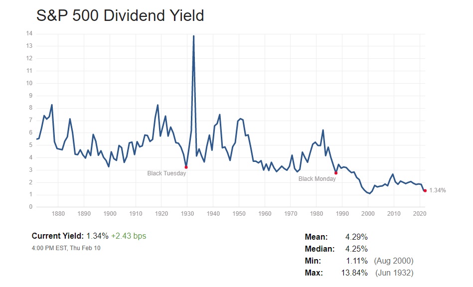 そしてもうひとつのチャートは配当利回りだ。悲観論を主張する賢者の論拠の一つは「歴史的に低い配当利回りは、株価がバブルであることの証左のひとつ」という。価格変動リスクがある株式に、現状の配当利回りの水準では投資するRISK-REWARDが見合わないという理屈だ。だがそれは株式にはその分の値上がり益という期待収益があり、更に、それは他に資金を振り替える先がある時の話だ。米国債10年債の金利が歴史的に最安値の水準である2%前後のこの時、どこに株を売って資金を振り向けるのが良いのだろうか?配当利回りの1.34%を享受しながら、値上がり益を期待するというのがRISK-REWARDの基本的な考え方であり、債券市場の水準論抜きに配当利回りの議論をすることは何の意味も無い。