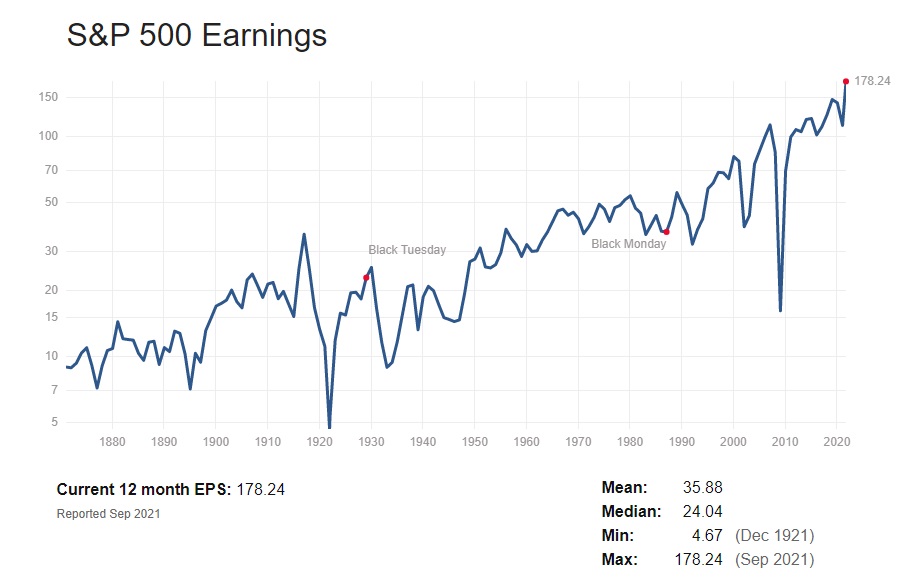 ならば、何を頼りに株価は上昇を続けてきたのだろうか。それを示すのが、次のチャートで示す企業業績だ。歴史的に2008年のリーマン・ショックなどを含めて、何度か大きな業績ディップはあるが、株価は金利推移とは関係なく、業績に正の相関をもって上がってきているのが分かる。これも対数チャートで示されているのを確認して欲しい。つまり株価と一緒の描画方法だ。株価は企業業績が上昇し続ける限り、短期的にはアップダウンがあっても、結局は上昇するという基本的なセオリーを確認して貰えるだろう。