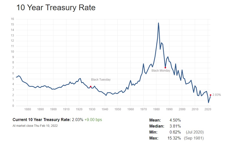 だが注意しないとならないのは、これはWar Riskに反応して、再度米国債が買われたあとの水準であること。週末の米国株式市場が下落した理由はこのWar Riskに絡んでであり、金利水準やFRBの姿勢によるものではない。従って、その前日2月10日のCPI上昇までを織り込んだ市場の水準を観察してみよう。10年債金利の2%レベルは2019年7月にまで遡らないと出てこない。そこで2018年からのチャートを使ってその水準感を確かめてみる。