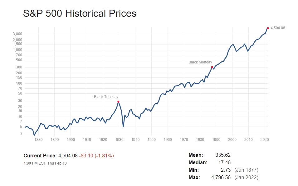 まずは下記のチャートを見て頂こう。ここに示されているのは、過去150年以上もの間、幾多のイベントを乗り越えながらも、米国株式市場が上昇してきたという歴史的な事実だ。このチャートは対数チャートなので、上昇幅ではなく、上昇率を示していることにも気を止めて欲しい。値幅で示すと二次関数的な動きになり、上昇が近年になる程加速しているように映り、解かり辛いのだ。