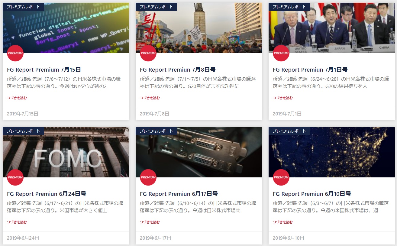 こうした時、多くの投資家は過去に遡って歴史を紐解く方法があまり無い。毎日「トレーディング・データ」などの手控えをコメントと共に記録している職業投資家は別だが、通常は無い。新聞のバックナンバーを広げようにも、そうそう図書館に行くのも面倒だ。だがそんな時に役立てて貰いたいのがFund Garageのプレミアム・レポートのバックナンバーだ。2019年2月からサービスを開始している。今見ると、当初の頃はアーカイブとしてお見せするのも赤面するような感じでもあるが「備忘録」としては役に立てると思う。