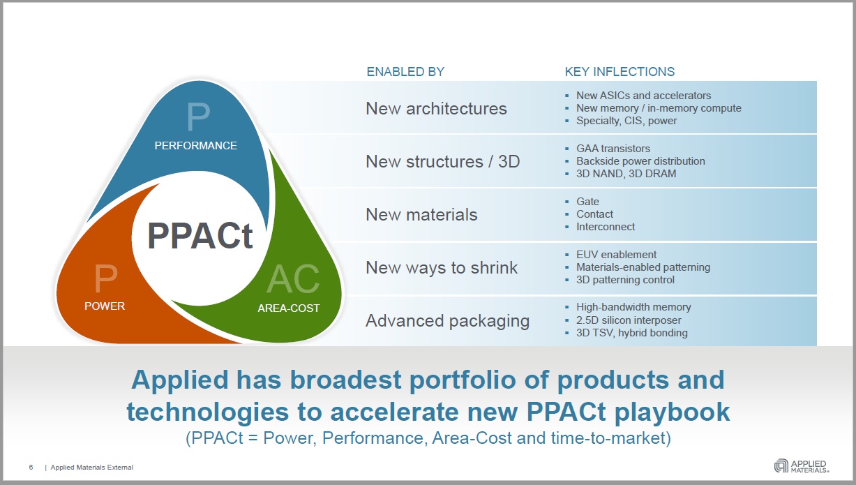 これら主要なテクノロジーの変化が具体化させるには、今までよりも多面的で複雑なものが要求されるが、これらは主にアプライド・マテリアルズのコアの強みである材料工学によって可能になる。そしてその結果、その成果が半導体として利用可能な市場全体を成長させる。