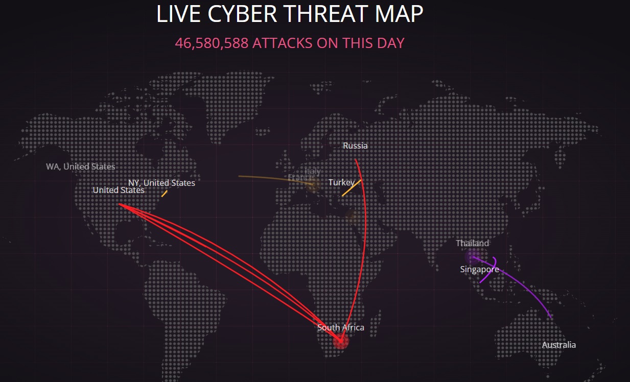 サイバーセキュリティと一口に言ってもその内容は多岐にわたる。身近なパソコンのウイルス対策ソフトのようなものから、ネットワーク機器やデータセンターへの侵入を防ぐものまで幅広い。上の図ではたまたまUSからSouth Africaへのラインが目立つが、リアルタイムで観て貰うと当然RussiaやChinaが関わることも多い。