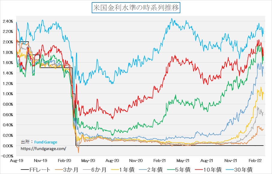 念のため、時系列のチャートの方も見て頂きたい。明らかに各期間の金利は「呑気に景気回復だからガンガン利上げ」などとタカ派のままではいられないだろうと考えたようだ。今の10年債金利の利回りは2020年1月23日頃の水準と等しいレベル、すなわちコロナが騒ぎなる正に前夜のレベルという感じだ。一旦は下記のチャートで描いている時期よりも遥か過去にまで遡った状態になりかけたのだから、かなり押し戻されたことが見て取れる。