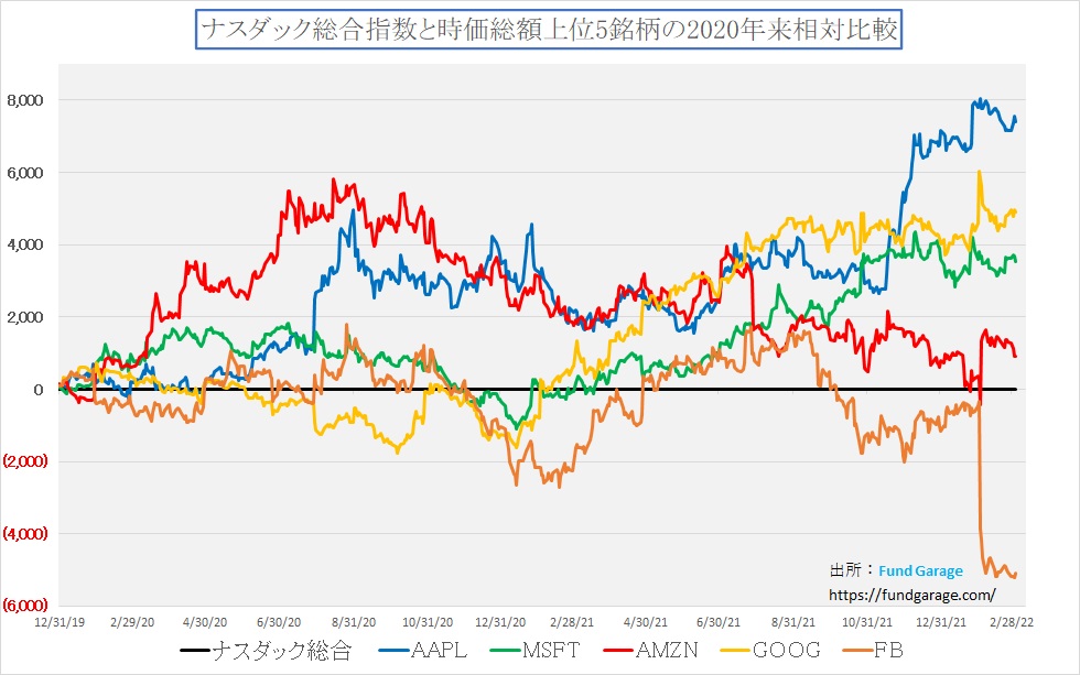 このコロナ禍の約2年、株式市場をリードしたのは、主としてデジタルトランスフォーメーション関連銘柄であり、或いは品薄・物不足が喧伝された半導体関連の銘柄達だ。事実、一時期は話題を浚った「GAFA+M」も、この1年間で見ると寧ろナスダックよりもパフォーマンスが悪い。アップルだけ昨年後半の一時期頑張ったが、メタ(旧Facebook)に至っては明確に足を引っ張った。下記のチャートはナスダックのパフォーマンスをゼロとして、それに対する「GAFA+M」個々の値動きを比較している。右肩上がりならば、ナスダックを牽引しているが、水平移動から右肩下がりになると寧ろナスダックの足を引っ張っている証拠だ。左肩下がりを続けるアマゾンなどは実は1年半以上も既にナスダックの重荷になっている。