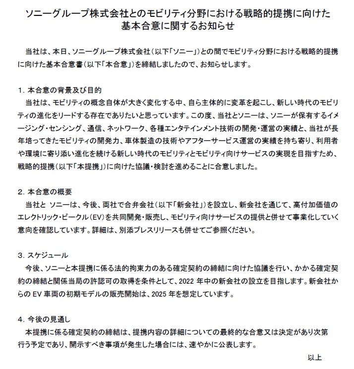 まさかこの両社に「提携するなら日本企業が良い」などという、妙なナショナリズムがあるとは思えず、真にビジネスライクな決定だろうとは思われるが、ホンダがF1レースなどで快勝し、「技術のホンダ」というイメージが高かった頃ならいざ知らず、目立ったEV経験も無い同社にSONYが寄った理由は何だろう。