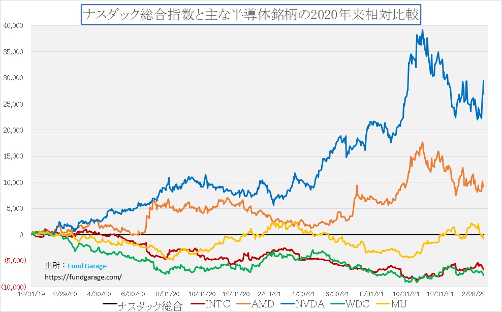 いつもの半導体主力5銘柄のな動きを示したチャートだが、この動きをジッと見ながら、この動きが示唆するものを考えていた。5銘柄の内、直近の動きがナスダックを大きくアウトパフォームしているのはエヌビディアしかない。AMDも、マイクロンテクノロジーズも、ウェスタンデジタルも、インテルも、皆ナスダックに合わせて月並みな動きでしかない。ならばなぜエヌビディアだけが大きくリバウンドし、そしてナスダックを更にアウトパフォームしているのだろう。