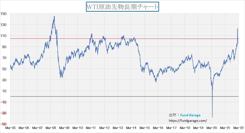 3月8日は123.7ドルまで上昇したWTI原油先物だが、3月15日は95.67ドルまで低下し、翌16日も95.41ドルと更に低下した。流石に週末は104.60ドルまで回復したが、その週末の水準に赤い線を引いたのが下のチャートだ。一目瞭然なのは、少なくとも2011年から2014年に掛けての水準と比べて驚愕するほどの原油高にはなっていないこと。この原油高が物価上昇の大きな材料であったことは事実なので、一方的な原油高に歯止めが掛かった可能性は朗報だ。