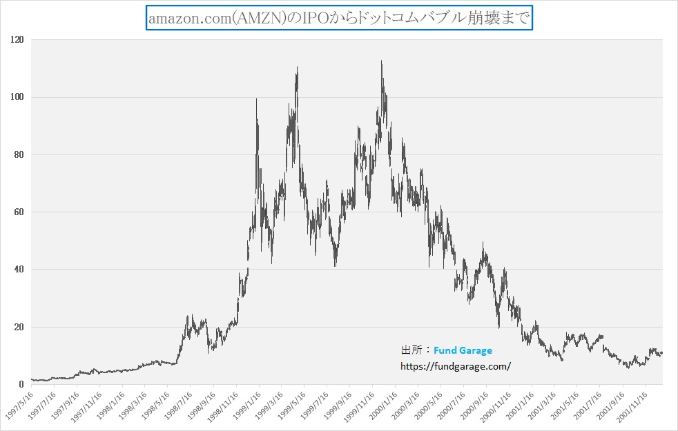 だが、この果実をフルに味わった人というのは創業者であるジェフベソズ氏以外には、実はそんなに居ないだろうと私は思う。「長期投資がお勧めです」と尤もらしい能書きをいうファイナンシャルプランナーやアドバイザーでも、間違いなくそんなアドバイスは出来ていないだろう。何故なら、同社の株価は余りに厳しい時代(腹の据わっていない投資家を超高速回転の遠心分離機で引き離すような)を乗り越えてきているからだ。下のチャートは、同社IPOからドットコムバブルが崩壊した2001年末までの日足を示している。分割後の株価で換算してあるのでY軸の数字は当時の株価とは一致しないが変化は正しく反映されている。