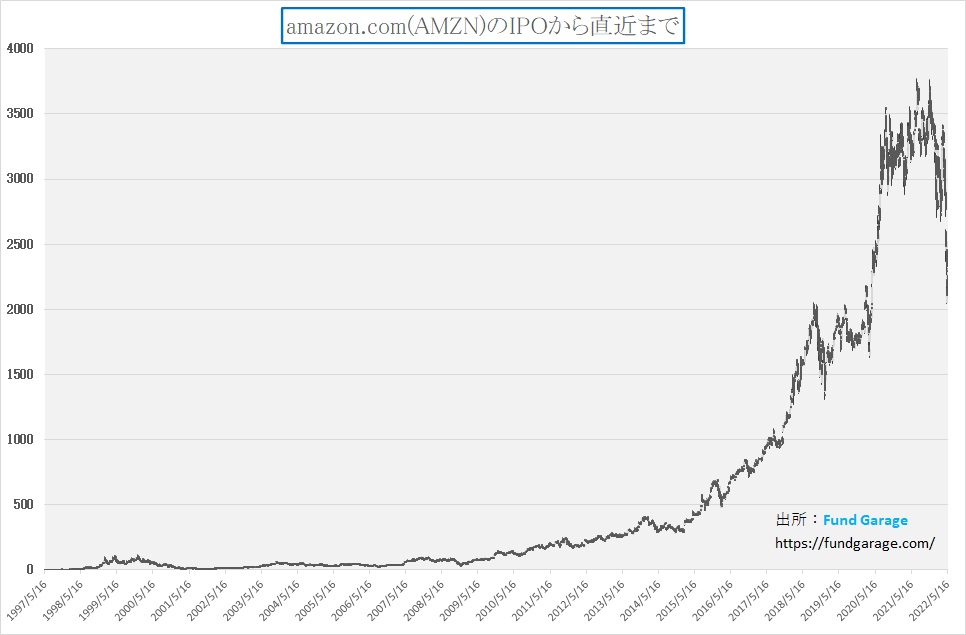 アマゾンドットコムがIPOをしてナスダック銘柄となったのは1997年5月14日、初値はなんと18ドルだった。そしてその後3回の株式分割を経て、その18ドルは現在の1.5ドルに相当する。今から25年前の話だ。仮にIPOの時点で10万円分のアマゾン株を購入していれば、高値から大きく下落したとは言っても、先週末現在で約1億4千万円相当(為替は考慮していないが当時は1ドル116.9円)の時価を今でも有している。まるで夢のような話に思われるかも知れないが、紛れもない事実だ。