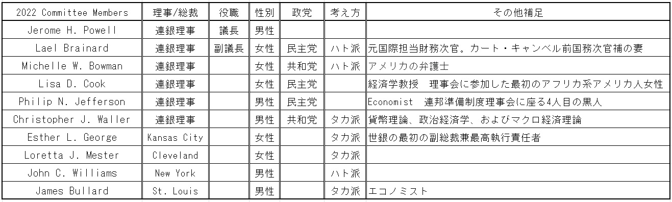 メディアはこの数日、「FRBの連銀総裁」が利上げの正当性を主張したことを殊更に取り上げている。5月23日にはアトランタのボスティック総裁、6月1日にはセントルイス連銀のブラード総裁、3日にはクリーブランド連銀のメスター総裁が9月まで利上げを続けるとコメントしたと報じているが、上記表を見てお分かりの通り、そもそもタカ派か、アトランタ連銀総裁のように現在は投票権を持たない影響のない人のコメントだ。この辺を押さえておかないと見間違えるだろう。