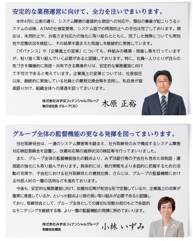 株主総会招集通知自体は『みずほフィナンシャルグループ 株主総会招集通知』と入力して検索すれば原本のPDFに簡単に辿り着くことが出来る。ケーススタディとして同社のそれを使ってチェックしてみると、前掲した通り、木原社長と小林取締役会議長のコメントがまず目に入る。他にも4社の社外取締役を引き受けながら、混乱続くみずほフィナンシャルグループで「グループ全体の監督機能強化の観点より、みずほ銀行等の子会社も含めた体制面・運営面の強化にも取り組む」ことが可能なのかと疑問を抱く。「みずほフィナンシャルグループ」はそこからの中小中堅企業とはわけが違う。第一勧業銀行、富士銀行、日本興業銀行だけでなく、その関連の信託銀行(安田信託銀行を含む)、多数の準大手証券会社、資産運用会社の集合体だ。私自身が三井住友銀行出身なので、銀行だけでも合併した場合の社内政治の混乱は骨身に沁みて実感しているが、その数よりも更に多いのだから、軽々しく「ガバナンス」などと言えるものではないのだ。