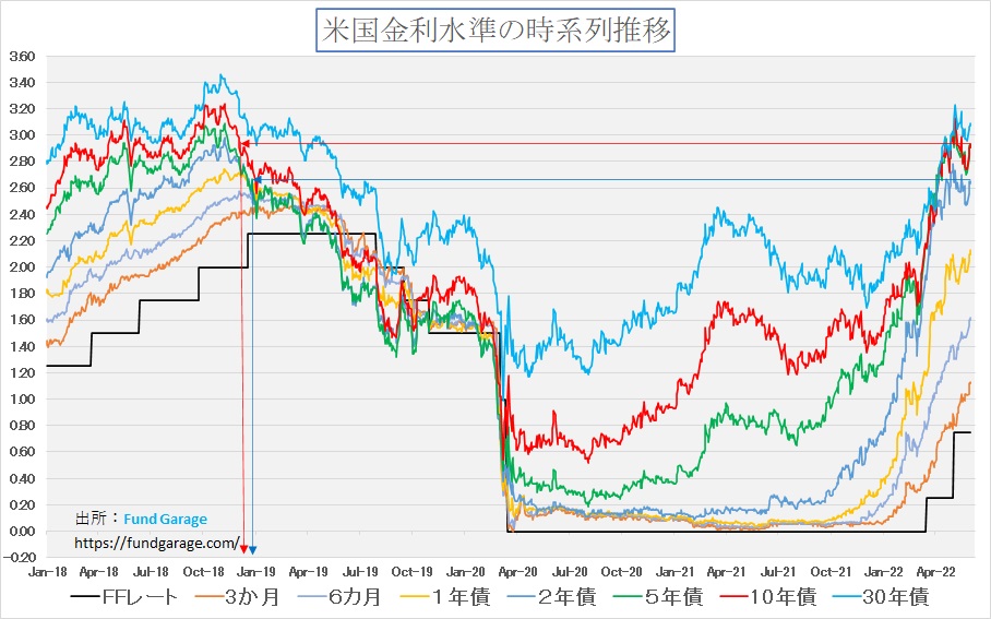 下記に時系列の米国の金利推移を示すと、見て取れるようにやはり3%の壁はそれなりに厚いようだ。ここを金利水準が順調に超えていくためには、原油価格の上昇や穀物価格の上昇などが更に深まって、景気失速を覚悟でインフレ退治、寧ろスタッグフレーション退治を優先するというホワイトハウス、若しくはFRBの明確な意思表示が必要だろう。だがそれが起きる確率は、高いとは言えない。