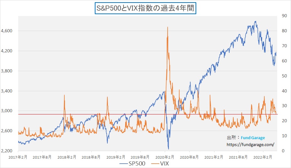 ならば米国株の状況はどうかということで、S&P500と恐怖指数の状況を確認しておこう。こちらも恐怖指数ことVIX指数は低下している。だが日本株ほどにはまだ絶対値として低下していないので、この水準でああだこうだと論じることは出来ないイメージだ。20を下回った段階で気にしても良いかも知れない。