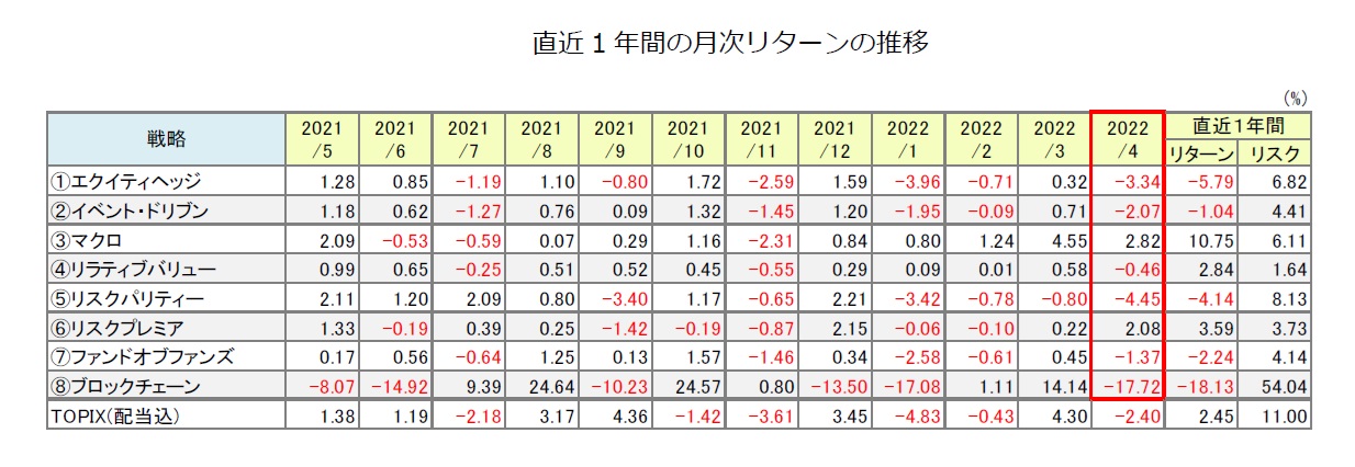 まず下記に示すのは、先月発表になった投資戦略別のヘッジファンドの月次騰落率の集計表だ。「ヘッジファンドのパフォーマンスが悪い」というのは聞いていたが、この表を見て本当に驚いた。ヘッジファンド・インデックスの類を見ても確かに悪いとは思っていたが、あらためてこの表を見ると驚かされる。ご存知の通り、ヘッジファンドの本来の収益目標は「絶対リターン」だ。それも当然「プラス」であること。色々なルールで入口制限を行い、高い信託報酬をとった上に、更に成功報酬を取るというのがヘッジファンドだが、本来その為にはそれなりなパフォーマンス成果を挙げていないと相手にされない。更に言えば、成功報酬が貰えるような状況で無ければ、多くのヘッジファンドはファンドマネージャーに報酬を払いきらない。だからこそ、ファンドマネージャー達も自分の食い扶持稼ぎのために相当に荒っぽく「仕掛ける」運用をするのだろうが、市場の中で運用パフォーマンスを挙げるということは当然のことながら簡単なことでは無い。