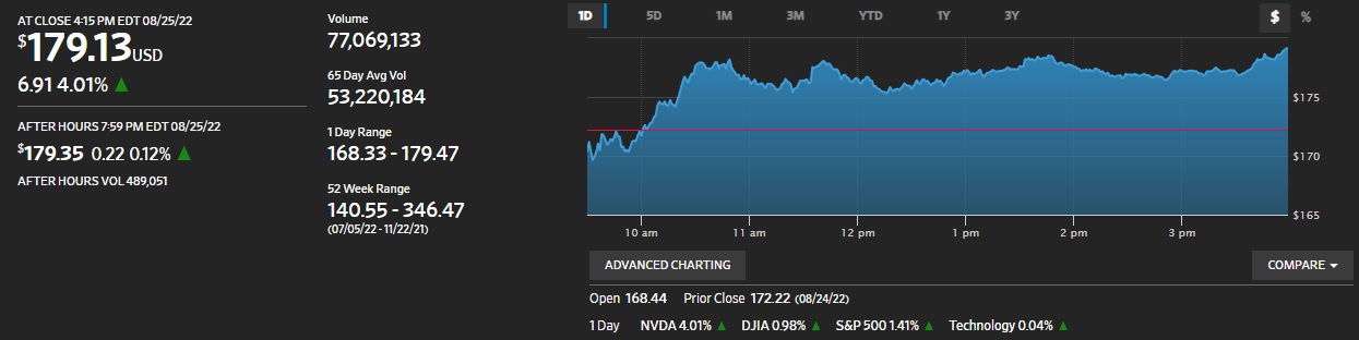 だが実際に25日の本市場でエヌビディア(NVDA)の株価は下記のチャートのような動きとなった。すなわち、+6.91ドル(4.01%)の上昇だ。それも、過去65日の平均取引量53百万株を50%程度も大きく上回る77百万株もの取引をこなしているので、ボリュームもそれなりにこなしている。