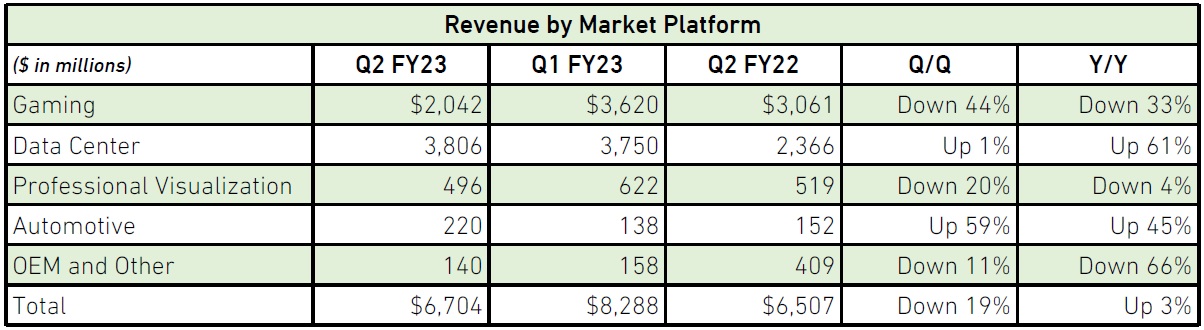 ただどうだろう。Q2 FY23とQ2 FY22を比較した時、つまり1年前の四半期と比較すると、祖業であるGamingとData Centerが殆どそのまま入れ替わっている。Data CenterでなぜGPUが必要かといえば、それがAI用途だ。