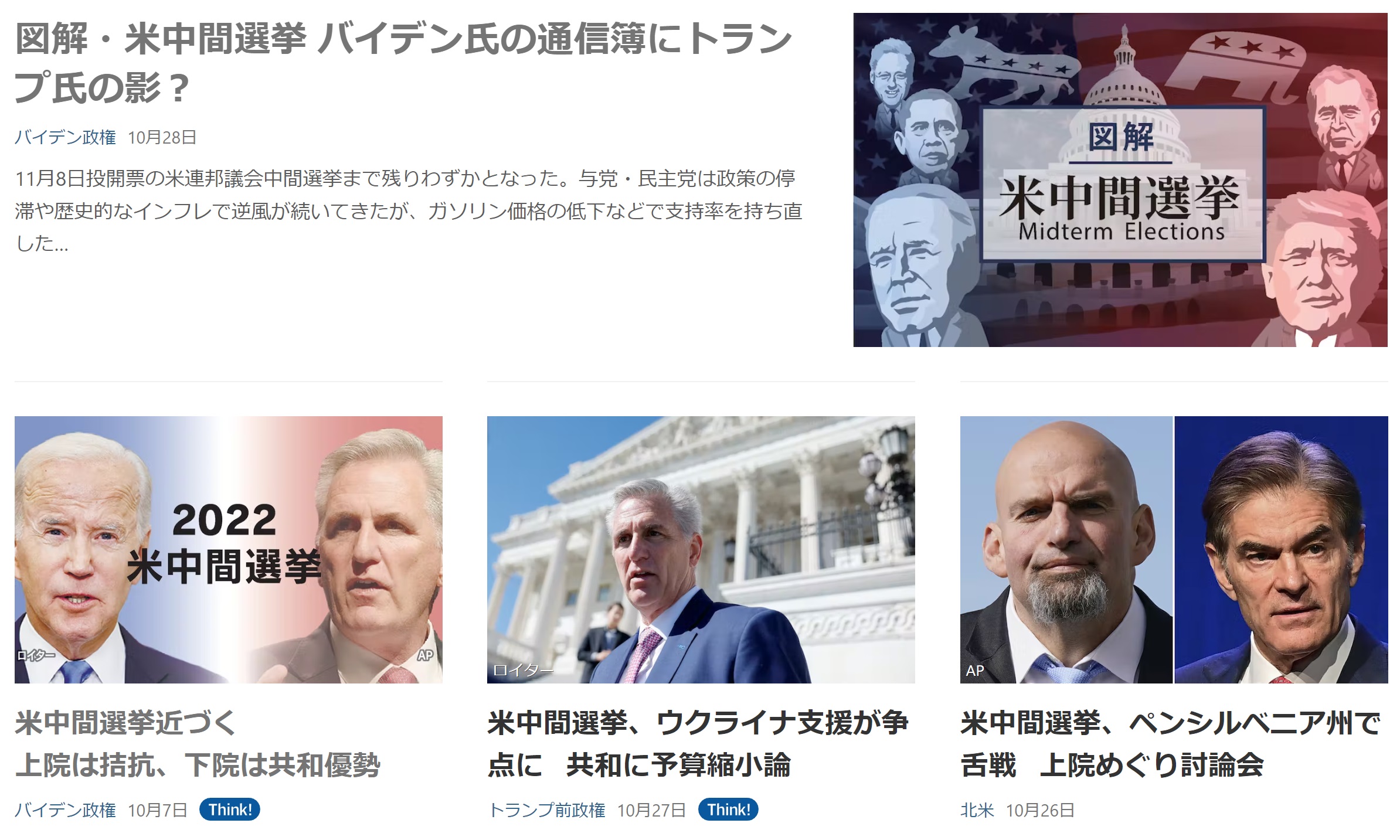 現在の日本株市場の最大の投資家が「海外投資家」であることは言うまでもない。またその変動要因の多くが(殆どが)、米国市場の動きであり、その背景にあるのが米国経済であり、更には欧州(英国を含む)経済がある。そして今現在、この足許で最もホットな話題はFRBの金融政策ではなく、米国の中間選挙の筈だ。だが日本では不思議なぐらい報道されない。因みに日経新聞の電子版、記事検索機能で「米中間選挙」と入力して表示される画面はこれだ(下記、クリックすると当該ページに飛びます)。最新の記事の日付が10月28日。つまりこの1週間は日経新聞でさえ、何もアップデートが無いとしか見えない。